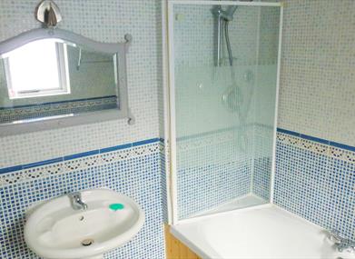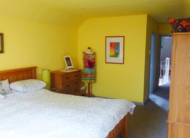 Downstairs the 2nd bedroom includes a king-size bed with luxury 1400 pocket-sprung mattress featuring comfort layers created from recycled plastic bottles. Adjacent is the downstairs bathroom, which has an electric walk-in shower, toilet, sink and washing machine. Iron and ironing board are stored here.