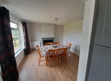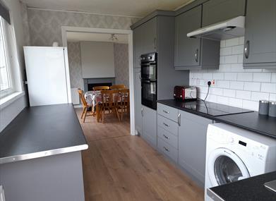 Modern kitchen and open plan dining room with lots of light and excellent views.