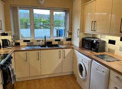 The large open plan kitchen, diner and living area is well equiped with large fridge freezer, cooker, microwave and washing machine plus a good selection of cutlery, crockery and utensils.