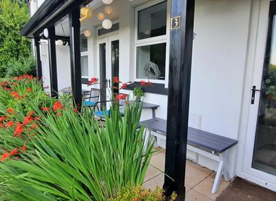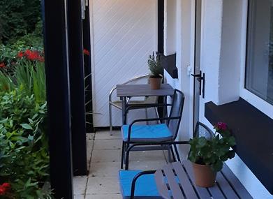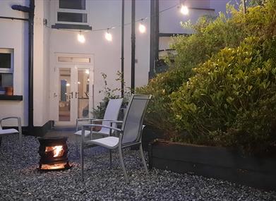 Private area to the rear of the house with seating area, BBQ, log burner and outside lighting.