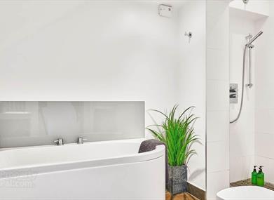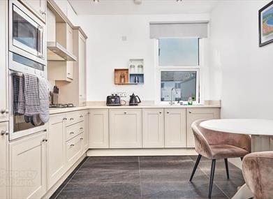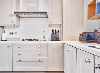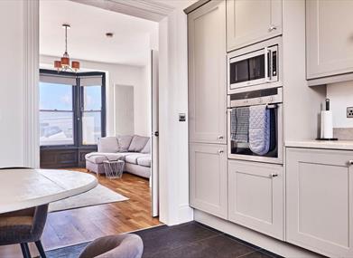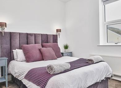 The large bay window living room is open plan to the kitchen dining area. The bedroom has loads of storage and a king sized bed with luxurious bedding.