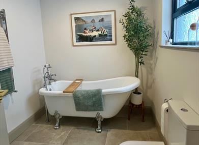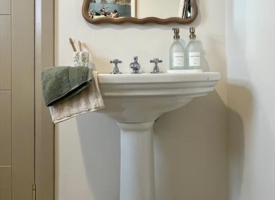 There are two full bathrooms. The bathroom downstairs features a clawfoot soaking tub with vintage details and an oversized ceramic pedestal sink. The upstairs bathroom features a large walk-in spa shower with a showstopping fully stone wash basin.