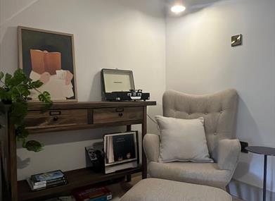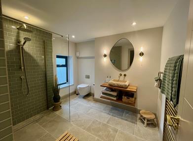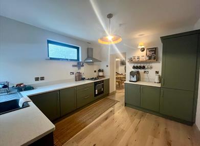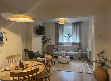 Past the entry hall with an open living, dining, and lounge space. There is ample seating for guests, and the room includes a HD smart TV with access to all of your entertainment apps (log-ins will be wiped at checkout for guests' security). This area also features a bluetooth-enabled vinyl record player, an assortment of vinyl records from Irish artists, an array of games for all ages, and selected books.
