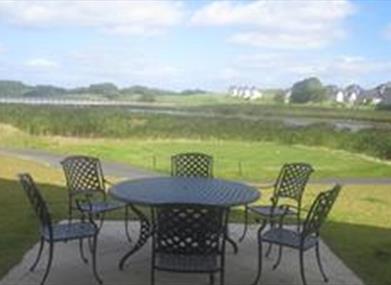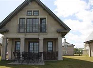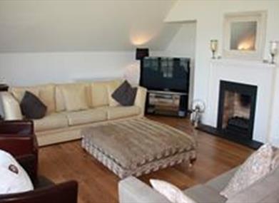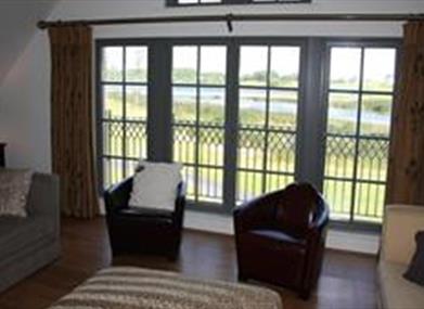Large living area with two set french doors overlooking the lake and the signature fifth hole of the Faldo designed championship golf course, with two large four seater sofas, two comfortable chairs, gas fire and 50 inch flat panel TV.