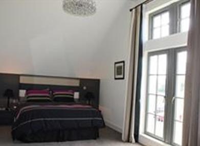 Master bedroom with french doors, double bed, sitting area and dressing table.