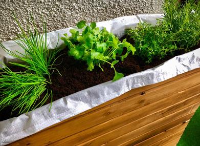 Our covered back yard has a micro herb garden, with grill and seating area.