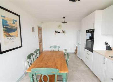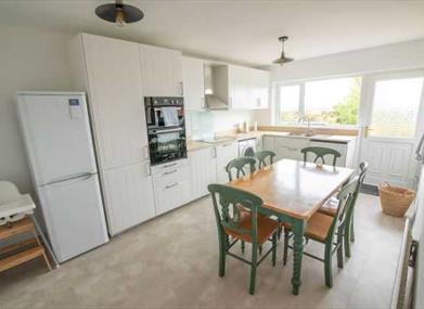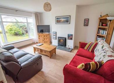 There is a cozy lounge and open plan kitchen/ dining area. The kitchen is equipped with dishwasher, washer/ dryer, eye level oven and induction hob. The backdoor leads out onto a lovely decked area with gas BBQ (please note failure to clean the BBQ after use will result in a £30 charge). The garden also has patio and grass areas with outdoor furniture. There is also a distant sea view.