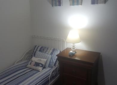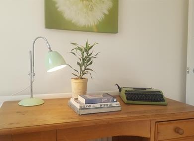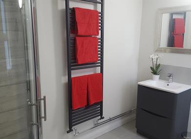 There is a large, stylish shower room and a utility room with ironing board and iron. There is a desk and chair in one of the single bedrooms, equipped with extension cable and lighting.