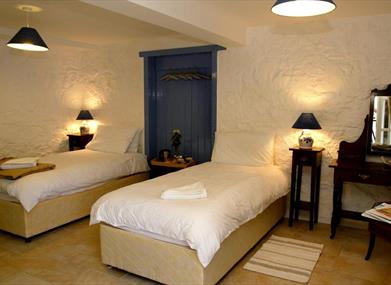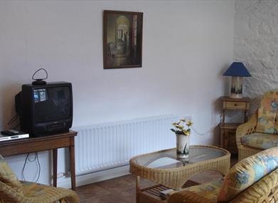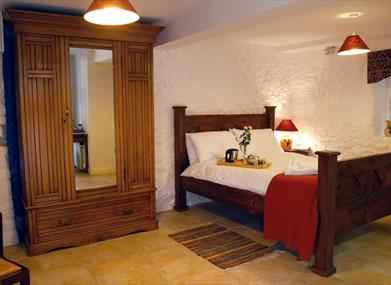 Potters' Cottage - ground floor with three steps down to Bedroom & en-suite Bathroom: open plan kitchen, living and dining area. Descend three steps into Double bedroom, en-suite with shower.