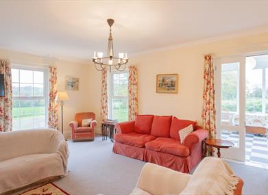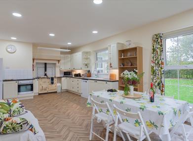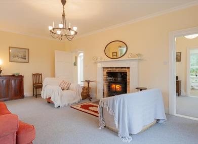 This spacious Georgian style house on one level is over 2000 sq ft so there is plenty of room for everyone.It has a large well equipped Kitchen Dining area, three hallways with wood burning stoves in Hall and Living Room, a Conservatory, 4 Bedrooms, one complete with ensuite and two others with washbasins. In addition to the ensuite in the master bedroom there is a bathroom with shower facilities and a washer and dryer, a separate shower room and another cloakroom with lavatory and washbasin beside the back door.