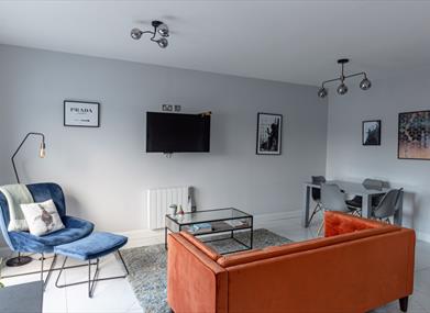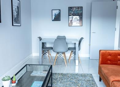 The spacious living room area has a table and four chairs to accommodate breakfast/lunch/dinner. There is also a three person sofa and a stylish and comfortable velvet chair and foot stool. The living room area leads onto a south facing balcony. The living room blinds are remote controlled and there is a wide screen TV with a range of terrestrial channels available.