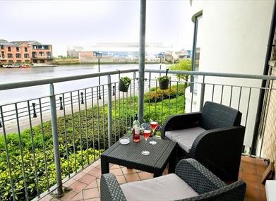 Our two bedroom/two bathroom city centre waterfront apartment is a spacious and modern accommodation with everything that you might need to make your stay a perfect one. The main bedroom has an en suite bathroom and there is an extra main bathroom also. There is a full width window area in the lounge, overlooking the river and a balcony with table and chairs also with great views across the river.The accommodation has all conveniences including well equipped kitchen with dishwasher, good sized LCD TV in the lounge with DVD/CD player, fast, reliable WiFi internet access throughout your apartment, two comfortable bedrooms, washer/dryer, central heating with instant hot water and secure parking and elevator.