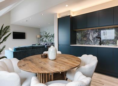 Apartment 8 is a luxury penthouse suite with private rooftop terrace and hot-tub, and a private balcony with a sea-views. There are two bedrooms comprising of a luxurious master suite with king size bed and ensuite bathroom, additional spacious second bedroom with bunkbeds sleeping up to 4, a main bathroom, and beautiful kitchen, dining and living area.