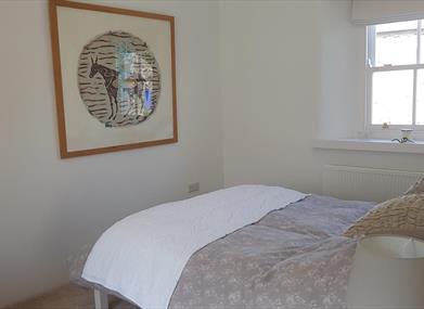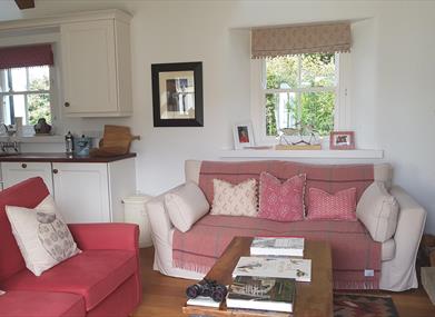 All accommodation is on the ground floor for easy access. There are two bedrooms - one with a king-size bed and one with twin beds - as well as a large open-plan living space with kitchen and dining area, and a bathroom with separate bath and walk-in shower. Double french doors open from the living room onto a small back garden with wooden bench, and there is on-road parking just outside the front door.