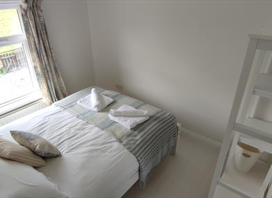 Second bedroom- Traditional painted wooden floor, double bed, hanging and storage open wardrobe.