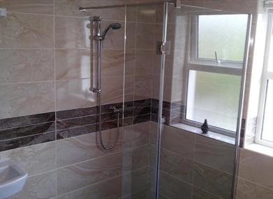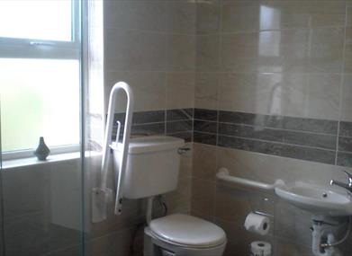 Luxury bathroom with walk in shower and facilities for wheelchair users.