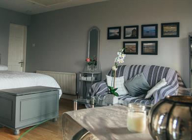 This is a spacious, bright, tastefully decorated, self contained annexe/apartment as part of a main dwelling with own private entrance for guests.The annexe comprises a large bedroom/studio with walk in wardrobe, twin settee, tv, free wifi and dining table. This leads to a compact kitchen area with fridge, microwave, washing machine and breakfast bar. Adjacent to this is the shower room with centrally heated power shower.