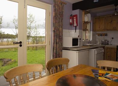 There are three bedrooms upstairs, one double and one twin-bedded and one family room, and a bathroom and toilet. Both have a patio overlooking the lake, and are centrally heated, fully furbished with pine throughout and accessible for wheelchairs.