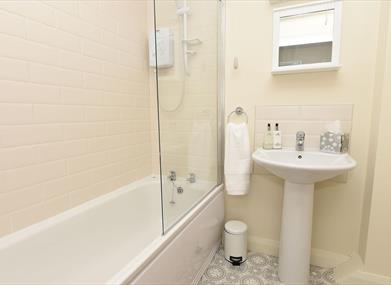 The bathroom has a bath and electric shower. There is a separate toilet with basin.