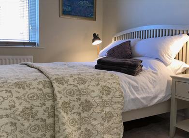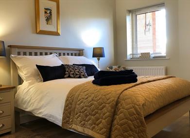 The master bedroom has a double bed with a slide robe, bedside tables and chair with views onto the river. The second bedroom has a double bed, wardrobe and beside table with views onto the well maintained gardens.