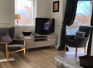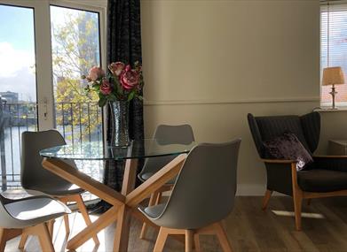 Our 2 bedroom apartment on the river Lagan in Belfast city has been furnished to a high standard with all the comforts of home. The open plan living and dining area enjoys a beautiful sofa bed and chairs with views onto the river with seating for 5 and a dining table and chairs for 4.