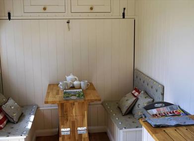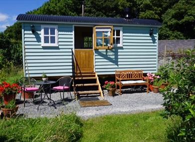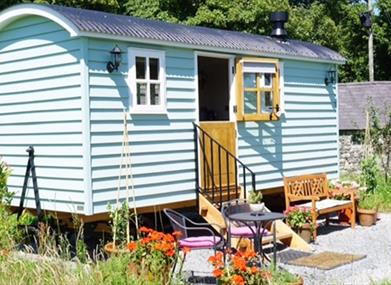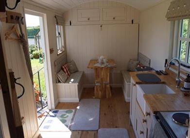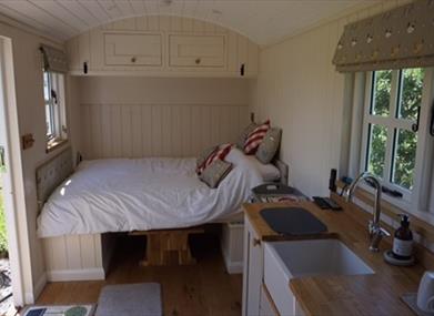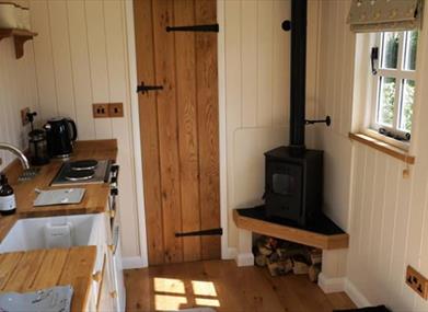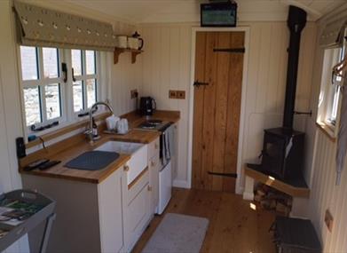 The shepherds hut is a bespoke build to fit into the orchard at Nutgrove. It has all the comforts of home, fitted kitchen, ensuite bathroom, double bed, log stove, electric heating and free sat television.Outside we have table and chairs so you have the pleasure of stepping out in the morning with a cup of freshly brewed tea or coffee into the glorious surroundings of the orchard and gardens with views of the Mourne Mountains.