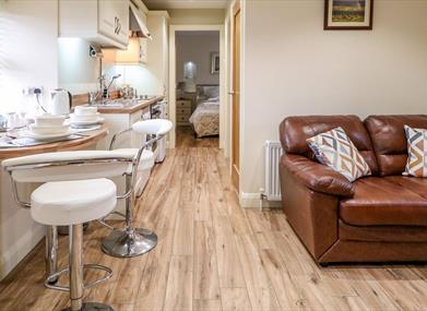 A breakfast bar acts as your dining area, thoughtfully placed looking out of the window so you can enjoy pretty views of your surroundings as you prepare for an adventurous day ahead.