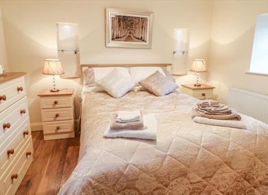 The neutral but fresh interior continues into the double bedroom, adding further style with pretty bedding, creating a lovely place to wind down.