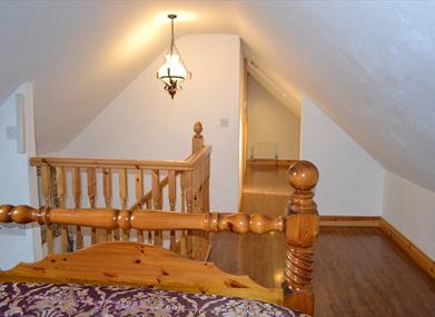 The Barn: This is a modern & cosy accommodation with mezzanine bedroom, it is very Cute & quirky! Mc Courts Barn comprises of a small open plan living/dining/kitchen area with shower room downstairs. The stairwell leads to a mezzanine bedroom with king size bed where you have wonderful views of the surrounding countryside from the comfort of the bed! The mezzanine has a Very low ceiling height, you will have to negotiate this lack of head height, but what else are beds for, only lying down??
