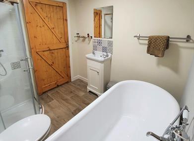 Created from part of the original stone barn, The Granary has a spacious living area with woodburning stove and adjoining kitchen-dining area with fitted kitchen. The two bedrooms on the lower level share a bathroom with freestanding bath and shower. The lower level features underfloor heating. This unit also has some of the original stonework and brickwork exposed which adds to it’s charm.