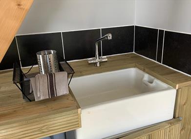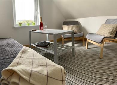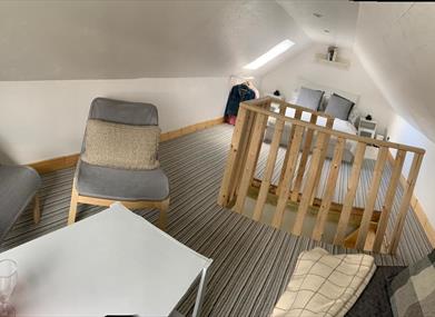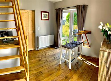 The Loft is a two story garage conversion with the kitchen area & bathroom room with shower located downstairs. Double patio door open on to a patio area. The upstairs comprises of an open plan living area & bedroom. The sofa folds out into an additional small double bed if required. The Loft is only suitable for guests with full mobility as the stairs accessing the living area is steep and the the upstairs has some low ceilings.