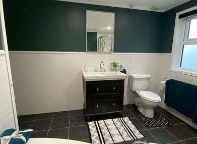 The bathroom has a corner bath and a separate shower. It also also has a beautiful Roco sink and vanity unit which affords guests the opportunity to store their personal products tidily and discretely.