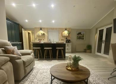 Mill quarter lodge has a large, open plan kitchen dining area with an adjustable sized dining table and an island for casual dining. Double doors lead off this room onto a black composite decking area which accommodates a Canadian Spa hot tub.