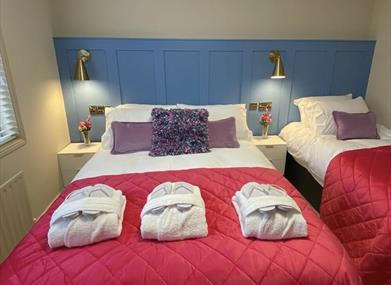 There are 4 beds - 1 king, 2 doubles and 1 single, sleeping 7. All bedding is provided with towels and a dressing robe for each guest. A cot / high chair is available on request.