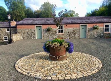Image shows front of cottages with flower bed in a stone circle