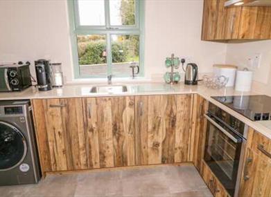 The wood effect kitchen presents a fine selection of fittings with integrated modern appliances, allowing you to cook up tasty meals for all to enjoy.