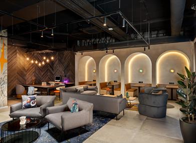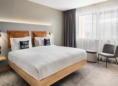 Gear up to experience the buzzing vibe of Northern Ireland's vibrant capital at Moxy Belfast City. Located in the heart of Belfast City, the hotel brings a fresh spin to Belfast's historic charm with a playful vibe, bold design, and a lively social scene. Explore the iconic sites such as Titanic Belfast and the artsy Cathedral Quarter, just steps from their doorstep. The lively lobby, complete with entertaining board games and a chic bar, invites you to kick back and relax, while spacious rooms ensure a good night's rest with their comfortable floating bedding. Enjoy seamless streaming of your favourite shows on the smart TV with high-speed Wi-Fi for your convenience. Switch effortlessly from work to relaxation, in their coworking and leisure space. With a complimentary welcome cocktail at check-in, a 24/7 grab and go station, and bold décor, they're redefining what it means to stay and play.