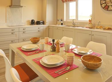 Fully fitted bright modern kitchen with all necessary appliances, Coffee machine, Oven, Fridge Freezer, Electric hob, Dishwasher, Washing machine, Dryer, iron & ironing board, clothes line, cookware and tableware for 5 guests.