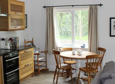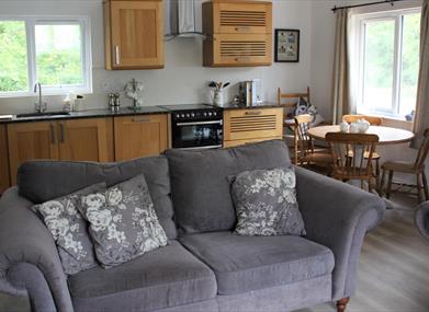Oak and Elm Lodge both have an open-plan kitchen dining living area. The kitchen is fully equipped for self catering and has a fridge freezer, hob/oven and a dishwasher. The living area has a TV and a wood burning stove with a complimentary basket of logs. There is a double bedroom with a king size bed and a twin bedroom which share a shower room, off the hallway. There is also a utility area with a washer dryer. A travel cot and high chair are available in each lodge. Outside, each lodge has private parking and a patio area perfect for enjoying summer evenings. A charcoal BBQ and outdoor furniture is provided.