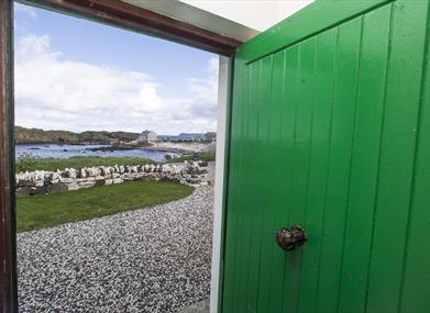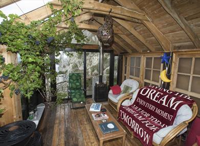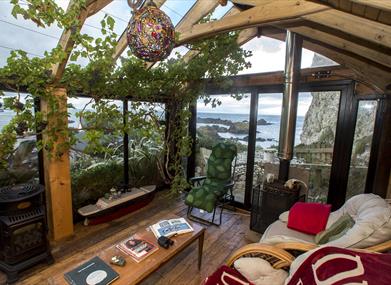 Garden sun room with gas stove on elevated position in the back garden giving year round views of the Atlantic Ocean and stunning seascapes.