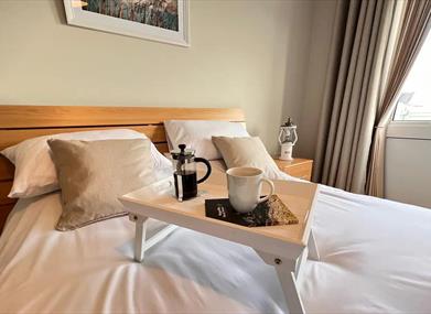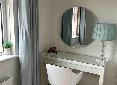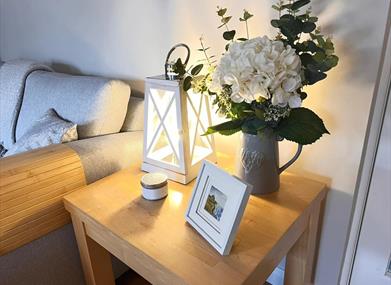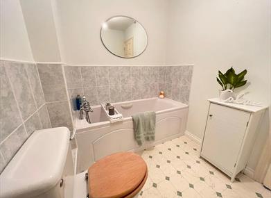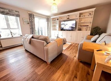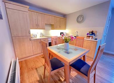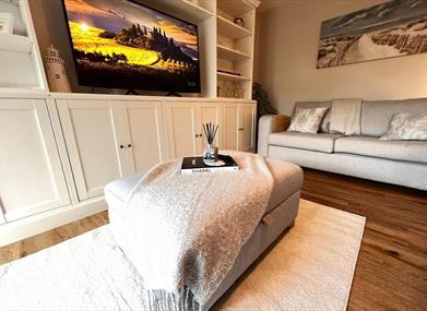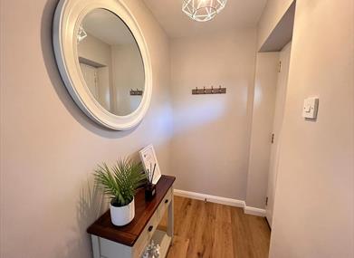 This delightful accommodation has a bright hallway which greets you as you enter the front door styled with a console table and mirror which leads you through to a fully equipped kitchen which includes storage cupboards, a washing machine, fridge freezer, electric hob and oven and is fully kitted out with cooking utensils, pots and pans and a kitchen table. The living area has 2 sofas footstool and a large 55" TV with Netflix.