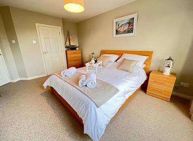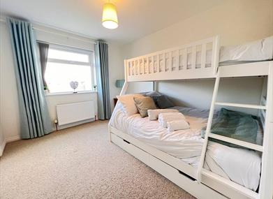 2 bedrooms one with a Kingzsize bedroom with ensuite (which incudes shower) and access out onto the private paved patio which includes patio table and 4 chairs, one bedroom with a triple bunk which includes a double and a single bed. Both bedrooms have built in wardrobes and drawer storage space.