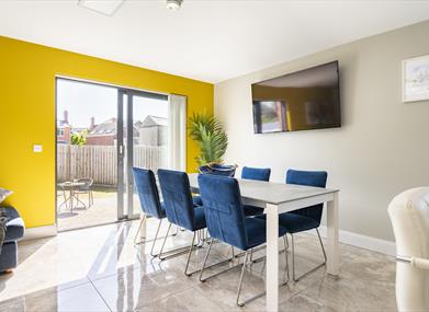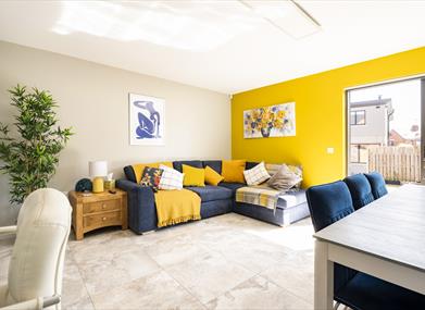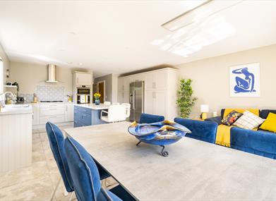 There are three sofas, seating six. The large open plan kitchen/dining/living has a brand new fitted kitchen with integrated dishwasher, fridge freezer, double oven and five ring gas hob. The dining area seats 10 with 6 seats a the dining table and 4 at the breakfast bar. The seating area has a comfortable 5 seater corner sofa and leads to the patio area via double doors.