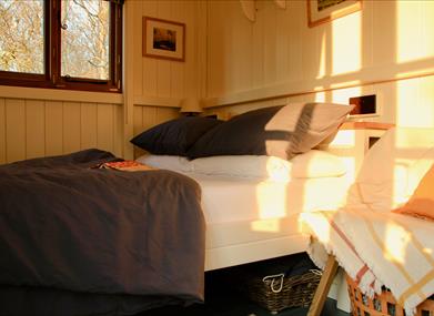 Each shepherd’s hut sits within its own generous, private space, accessed by a boardwalk and opening onto a generous deck. Inside, guests will find: