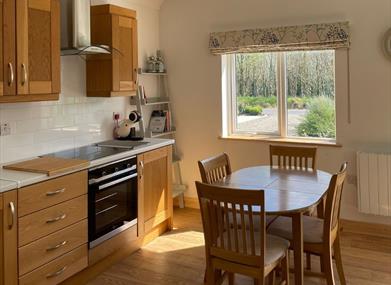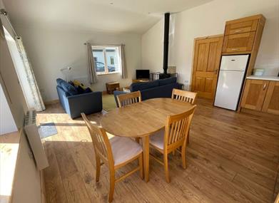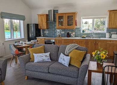 Pine and Willow Lodge both have an open-plan kitchen dining living area. The kitchen is fully equipped for self catering and has a fridge freezer, hob/oven and a dishwasher. The living area has a TV and a wood burning stove with a complimentary basket of logs. There is a double bedroom with a king size bed and a twin bedroom which share a shower room, off the hallway. There is also a utility area with a washer dryer. A travel cot and high chair are available in each lodge. Outside, each lodge has private parking and a patio area perfect for enjoying summer evenings. A charcoal BBQ and outdoor furniture is provided.