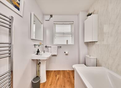 The accommodating apartment features a full bathroom with pampering towels and necessities to ensure a carefree stay.