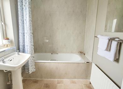 Sanitary: Bath with shower, Washbasin, Hairdryer, Towels, Toiletries