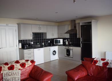 The apartment consists of one king sized, en suite bedroom, and a further double/ single bunk room. The property also has a nice family bathroom with a bath and walk in shower. The property has a lovely, spacious open plan kitchen dining and living area suitable for all the family to socialise in. The kitchen comes equipped with washing machine and dish washer.