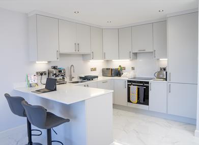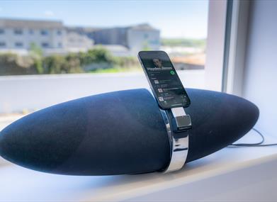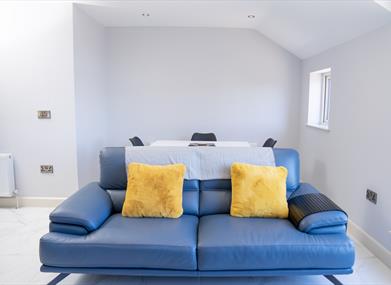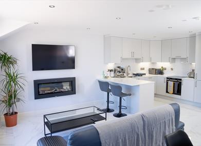 The cottage includes a bright and contemporary living room area with stunning views over the beach and sea. The kitchen also comes equipped with a range of new mod cons including a Sage Barista Pro Touch coffee machine. The downstairs communal bathroom is elegant and spacious equipped with a stylish power shower and bath tub.