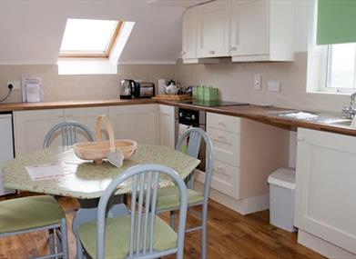 The cottage rovides a spacious open-plan lounge, kitchen and dining area open onto the balcony through French doors. Downstairs, the cottage offers spacious double and twin bedrooms (plus pull out single camp bed under the stairs suitable for children under 12), with the bathroom which has a bath, shower and electric shaving point.